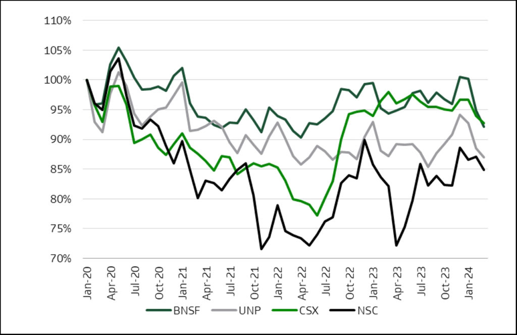 Severe weather led to a soft start to rail carloadings in 2024 (which was widely discussed during 4Q calls in January), though carloadings have picked up since and are now up 2.5% YTD. Intermodal carloadings lead the group at 8.6% growth in the U.S. through the third week of March. Non-metallic Minerals and Products is the largest decliner, down 8.8% YTD. BNSF is seeing the largest carloadings growth so far this year at 5.6%, led by intermodal at 18.7%. Despite the welcomed rebound, volumes are still 4.1%% below 2019 levels. The U.S. Class I’s look for a lever for top line growth as freight rates have broadly declined and rails work to improve service to win business back onto the network.
