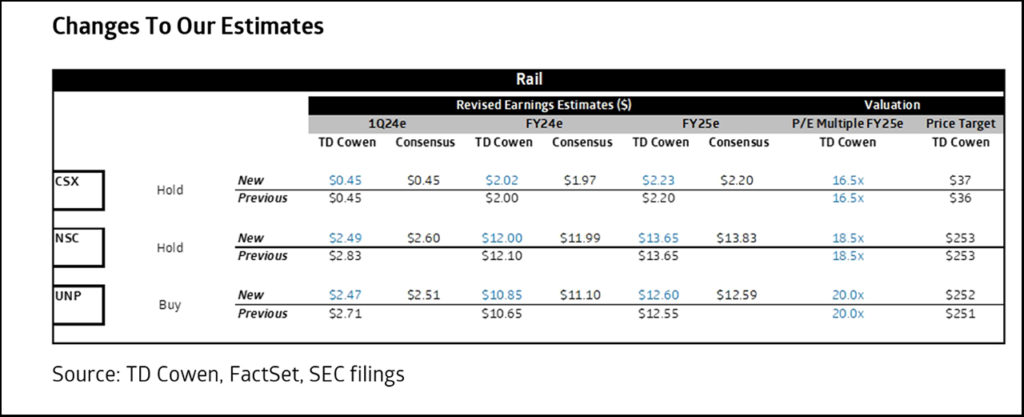 Panelists on our recent Railroad Happy Hour spoke to chemicals, paper and bulk segments rebounding (or, at the very least, finally finding a bottom) after having a soft 2023. Our energy panelist has seen downward pressure on demand with natural gas prices sitting at multiyear lows. His outlook remains fairly bleak as wells are coming offline and crews are sitting idle. Two panelists highlighted that NSC is addressing some challenges in the Northeast and going after some new business (waste), which it hasn’t showed in the past.