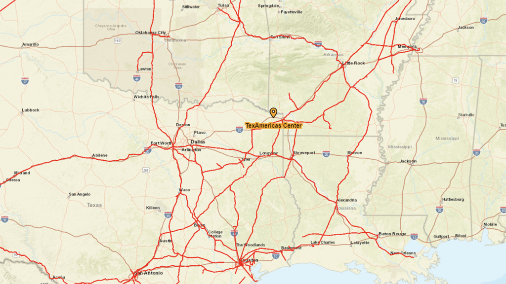 Located on the Texas side of the Texarkana metropolitan area, TexAmericas Center offers roughly 12,000 acres of land and approximately 3.5 million square feet of office, manufacturing, warehouse and storage space, as well as access not only to rail but also to interstate transportation (see map below). TexAmericas Center, which serves Arkansas, Louisiana, Oklahoma, and Texas, is described as “well-positioned to serve as a central hub for rail-dependent manufacturing businesses, freight handling and logistics services.”