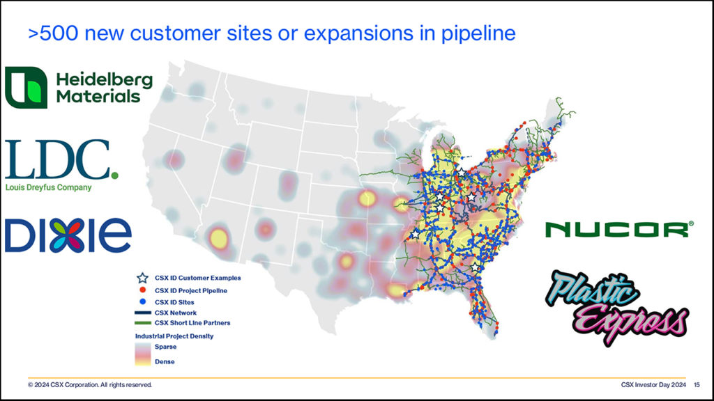 An anticipated growth in industrial development projects should also help CSX restore growth across its network. There has been an increasing amount of industrial investment happening in the U.S., with 100 projects per year coming on line. The pipeline is very large at 500 new customer sites being targeted and are heavily focused in the east (Maine-Miami-Chicago-New Orleans). This is roughly double what the pipeline was five years ago, according to CSX VP of Business Development and Real Estate Christina Bottomley. Over next three years, the railroad estimates these projects could add 150,000-300,000 carloads, which would help net carload growth by 1%-2%.