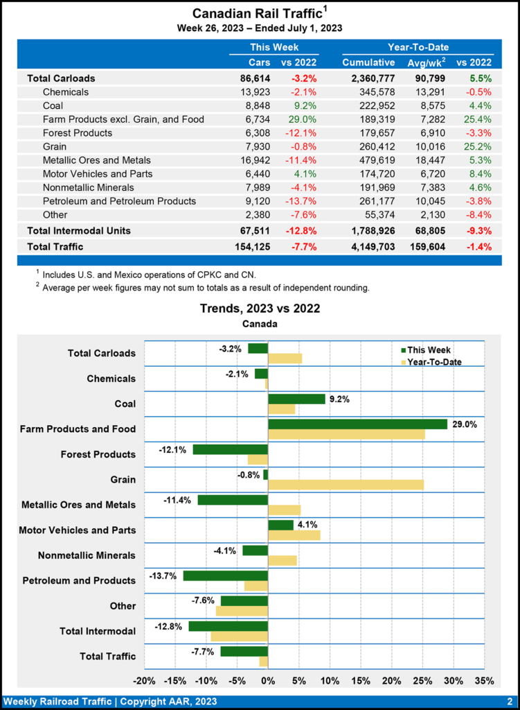Canadian railroads reported 86,614 carloads for the week ending July 1, 2023, down 3.2%, and 67,511 intermodal units, down 12.8% from the same point last year. For the first 26 weeks of 2023, they reported cumulative rail traffic volume of 4,149,703 carloads, containers and trailers, a 1.4% decline from the same period in 2022.