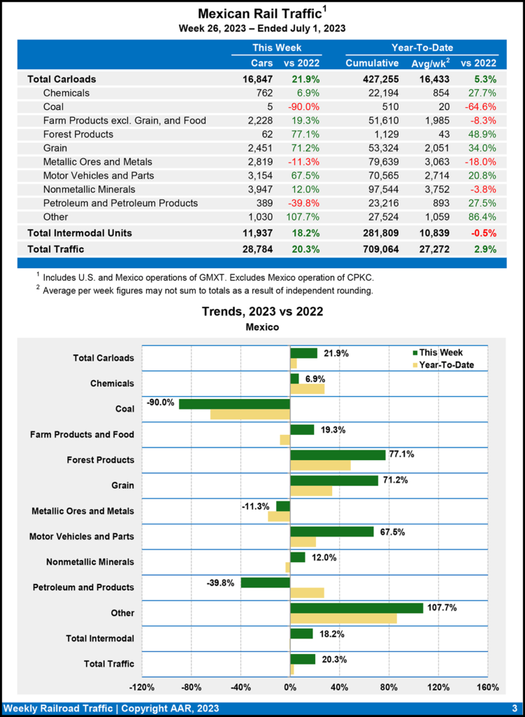 Mexican railroads reported 16,847 carloads for the week ending July 1, 2023, rising 21.9% from the same week last year, and 11,937 intermodal units, gaining 18.2%. Their cumulative volume for the first 26 weeks of this year was 709,064 carloads and intermodal containers and trailers, up 2.9% from the year-ago period.