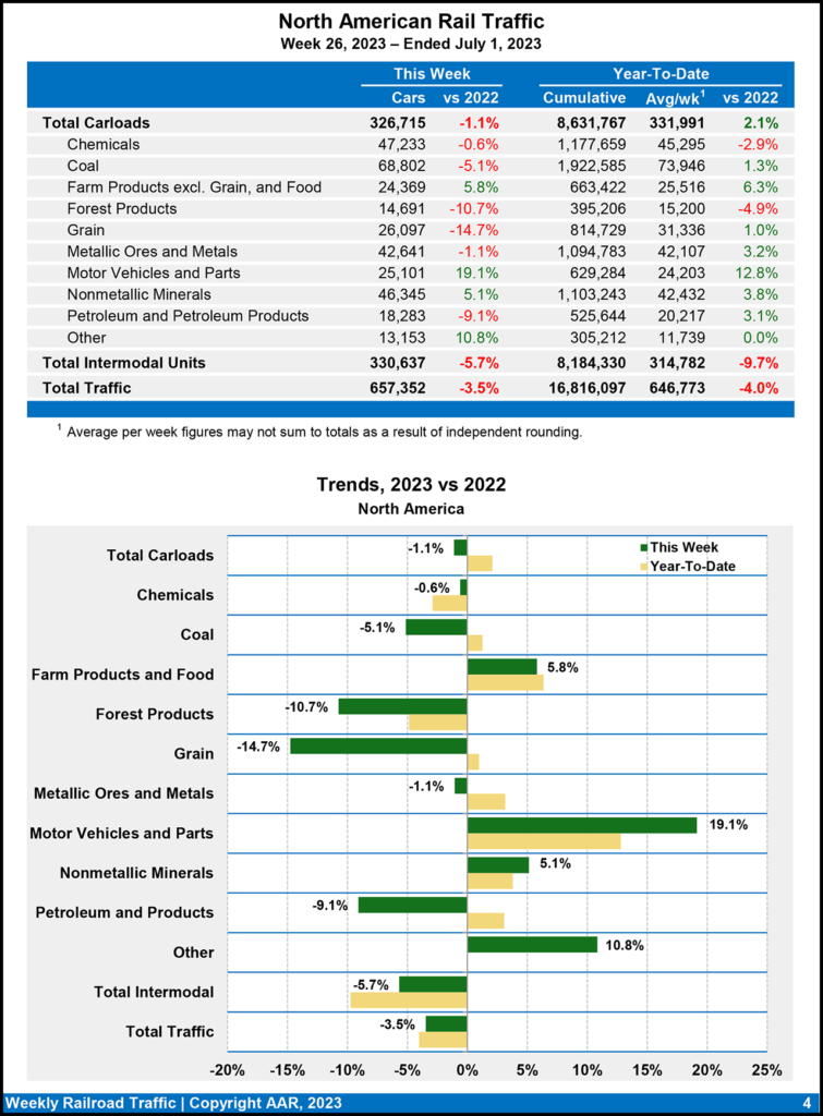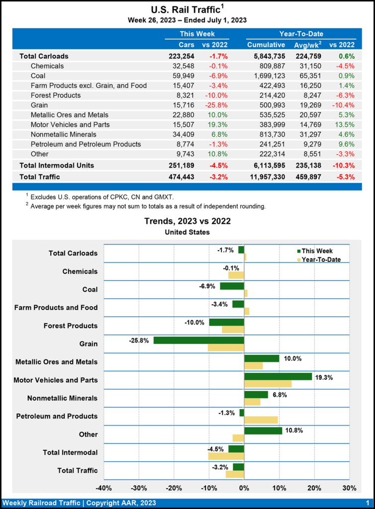 Total U.S. weekly rail traffic was 474,443 carloads and intermodal units for the week ending July 1, 2023, down 3.2% from the same week in 2022, according to the AAR.
