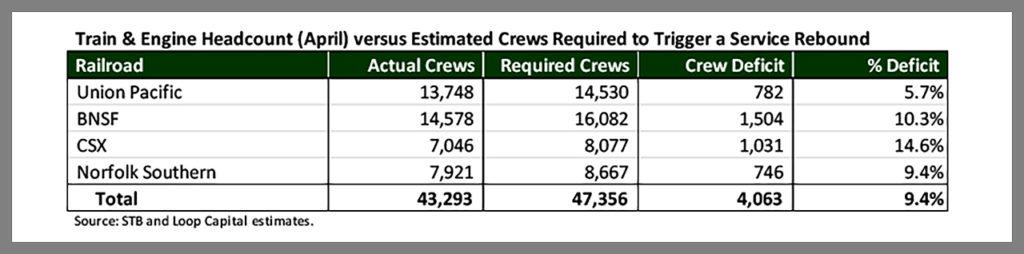 Updating our crew models with the most recent data points for network velocity (last week) results in the following updated estimates with regard to the minimum number of additional crews required to trigger a service recovery. We’ve regressed slightly, with net velocity for the four major systems slightly slower last week, which pushes our estimated crew deficit from ~4,000 to ~4,100.