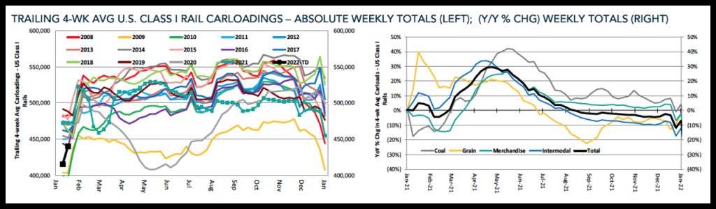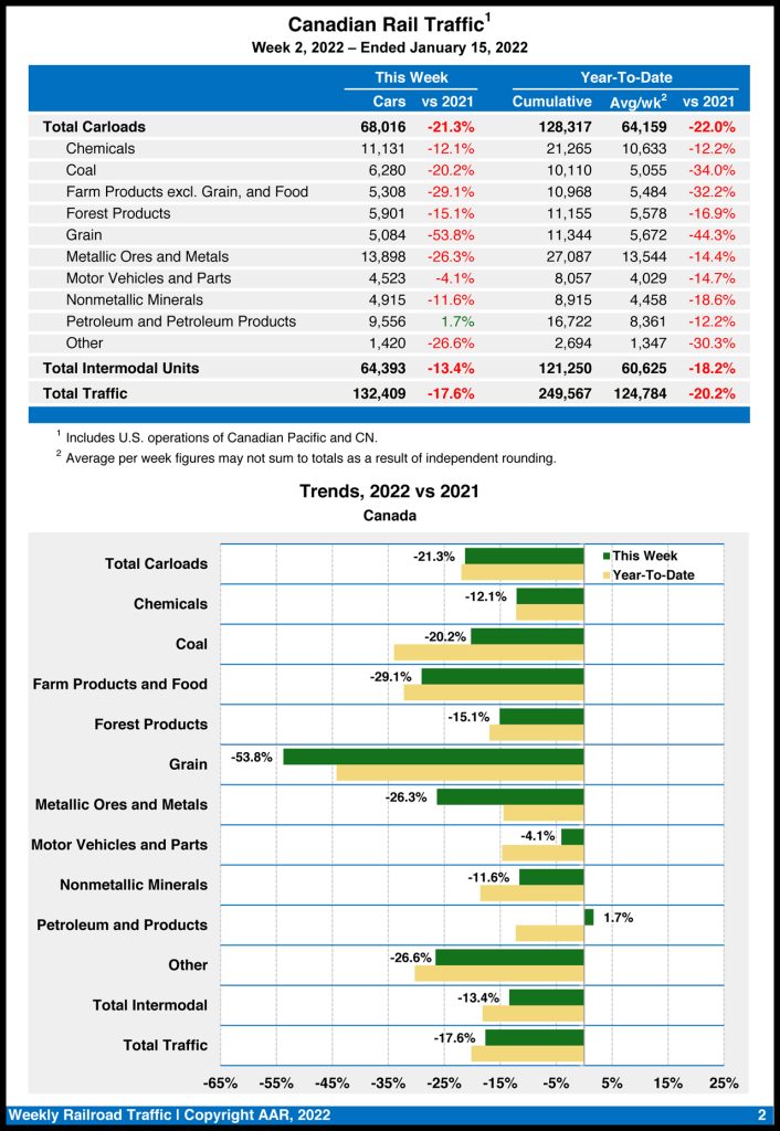 Canadian railroads reported 68,016 carloads for the week, sinking 21.3%, and 64,393 intermodal units, declining 13.4% compared with the same week in 2021. For the first two weeks of 2022, they reported cumulative rail traffic volume of 249,567 carloads, containers and trailers, down 20.2% from the same period last year.
