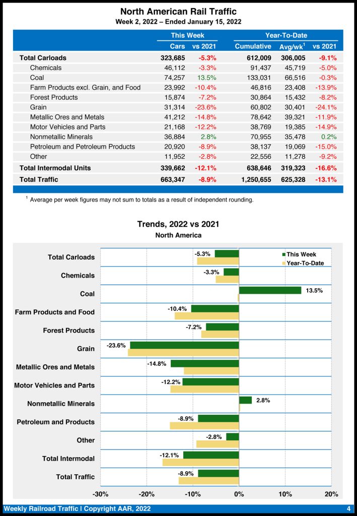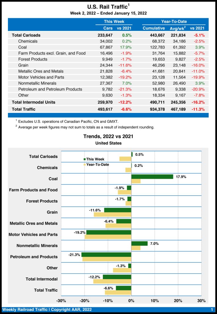 Total U.S. rail traffic for the week ending Jan. 15, 2022 was 493,617 carloads and intermodal units, down 6.6% from the same point last year, the Association of American Railroads (AAR) reported on Jan. 19; it is the second consecutive week that traffic has dropped.