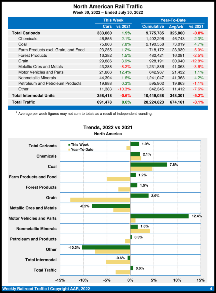 Total carloads for the week ending July 30, 2022, came in at 237,079, up 3.6% compared with the same week in 2021, while U.S. weekly intermodal volume was 268,330 containers and trailers, down 1.9% from 2021.