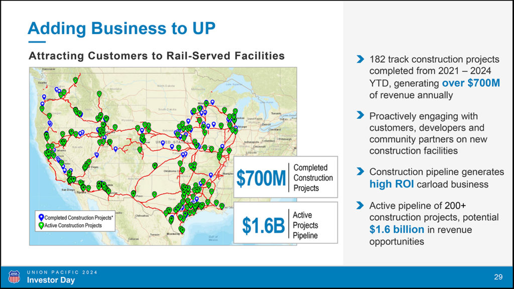 There have been 182 track construction projects completed from 2021-2024 YTD that generate $700MM of revenue annually. There are currently 200-plus construction projects in the pipeline that offer $1.6B in revenue opportunities, which come with “great margins.” UNP has a team that works with RE developers to offer shovel ready sites for customers.