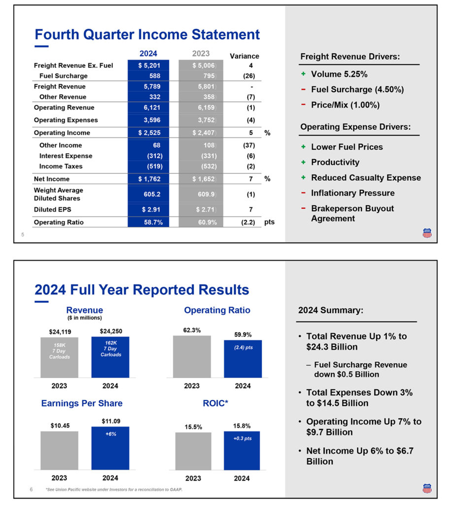 Union Pacific’s 4Q24 $2.91 diluted EPS was based on net income of $1.8 billion, compared to 4Q23 net income of $1.7 billion, or $2.71 diluted EPS. These results include $40 million of labor expense related to the ratification of a crew staffing agreement. Reported net income for FY24 was $6.7 billion, or $11.09 diluted EPS, compared to FY23 net income of $6.4 billion, or $10.45 diluted EPS.