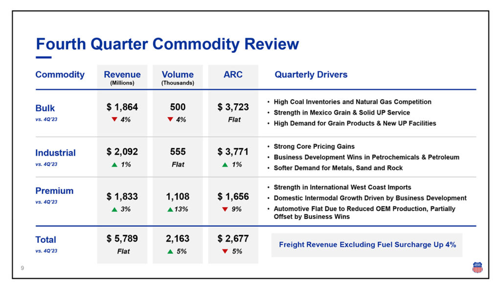 Union Pacific’s Full-Year 2024 financial results included operating revenue of $24.3 billion, up 1%, “driven by increased volume and core pricing gains, partially offset by lower fuel surcharge revenue, unfavorable business mix, and lower other revenue.” revenue carloads increased 3%. The OR improved 240 basis points to 59.9%. Operating Income of $9.7 billion was up 7%. The 2024 capital program totaled $3.4 billion, and the company repurchased 6.3 million shares in 2024 at an aggregate cost of $1.5 billion.