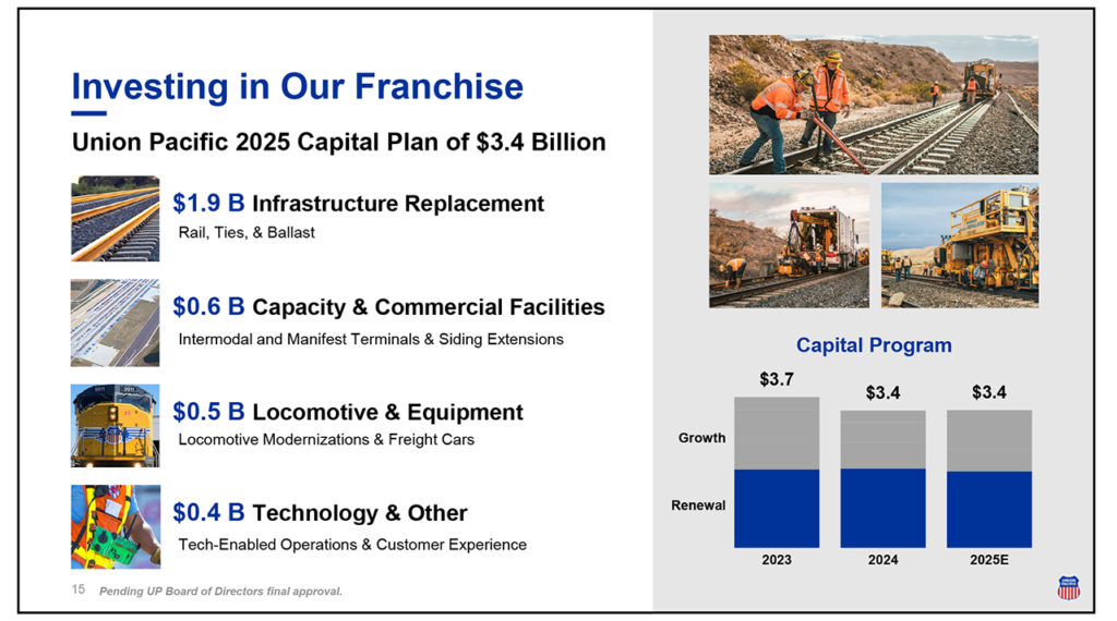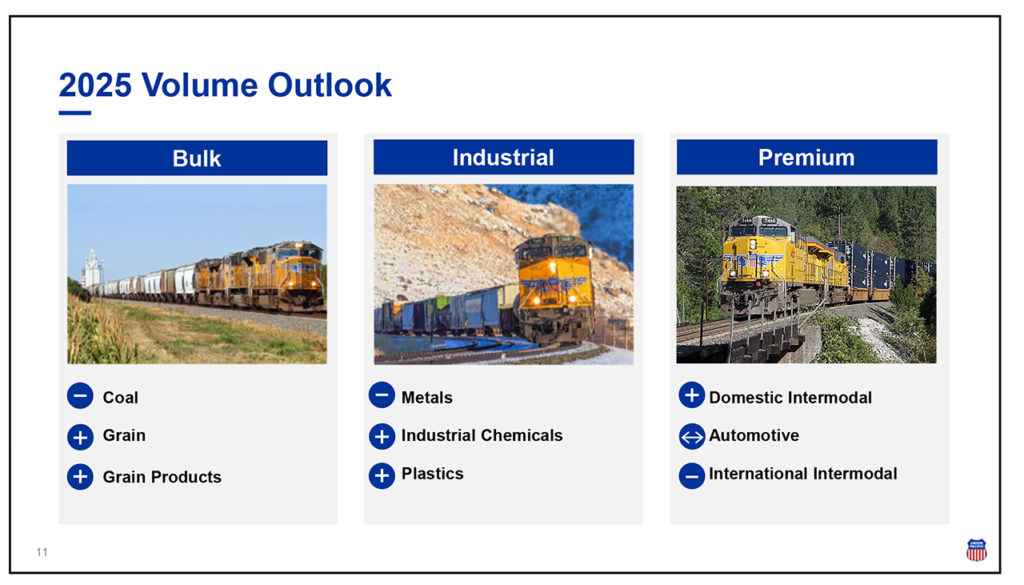 For 2025, Union Pacific’s outlook is “on track with Investor Day targets.” The railroad expects volume to be impacted by a “mixed economic backdrop, coal demand, and challenging year-over-year international intermodal comparisons.” Pricing dollars will be “accretive to operating ratio.” EPS is expected to grow, “consistent with attaining the three-year CAGR (compound annual growth rate) target of high-single to low-double digits.” An “industry-leading OR and ROIC” is forecast, based on “no change to the long-term capital allocation strategy,” a $3.4 billion capex plan, unchanged from 2024, and higher share repurchases of $4.0 to $4.5 billion.”
