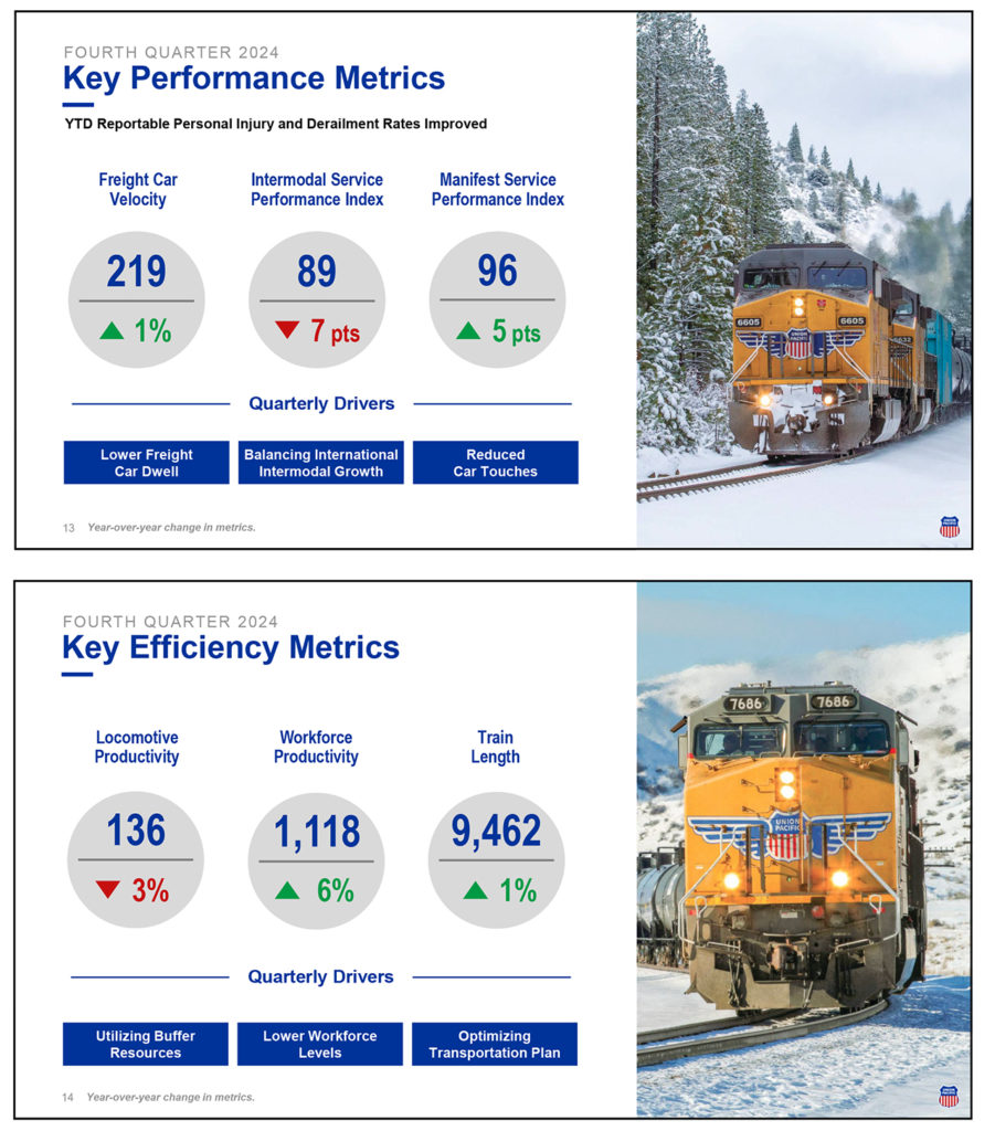 For full-year 2024, Union Pacific’s operating performance reflected “strong improvements in safety, service, and operational excellence, and a workforce productivity record.” The FRA reportable personal injury and reportable derailment rates improved. Freight car velocity improved 2% to 208 daily car-miles. Locomotive productivity improved 5% to 135 GTMs per horsepower day.  Workforce productivity improved 6% to 1,062 car-miles per employee. The fuel consumption rate improved 1% to 1.082.