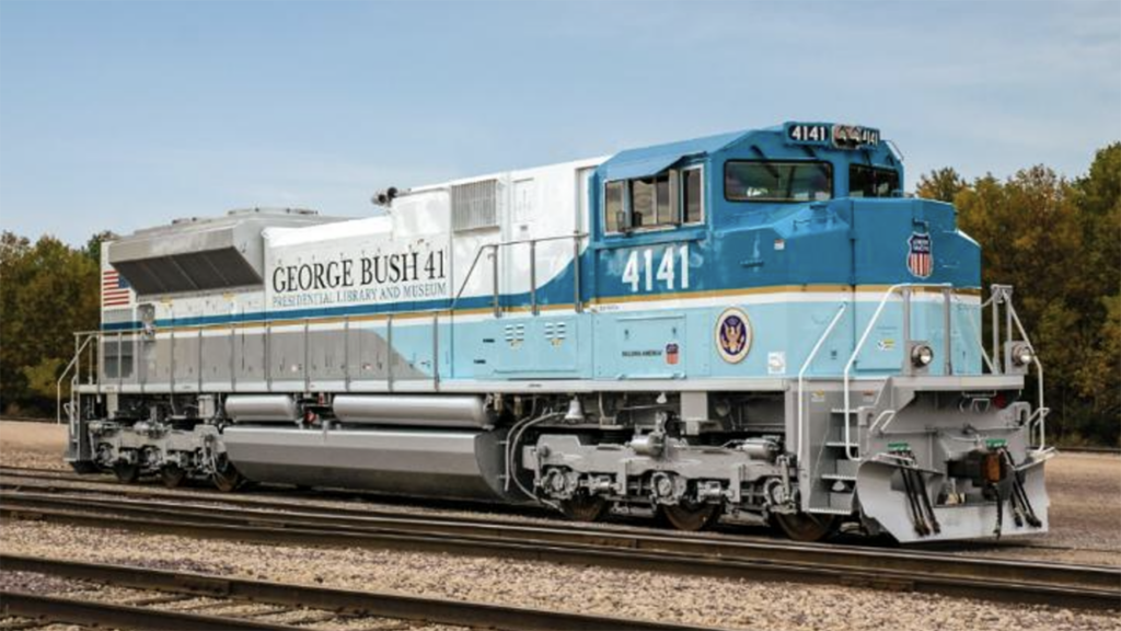 No. 1616 is the second presidential locomotive in UP’s Heritage Fleet, joining No. 4141, which was created in 2005 to honor President George H.W. Bush and only the sixth locomotive at the time to be painted in colors other than the traditional UP “Armour Yellow.” On Dec. 6, 2018, the Class I participated in President Bush’s funeral train, led by No. 4141, from Spring to College Station, Tex., where the locomotive is on permanent display at the George Bush Presidential Library and Museum’s Marine One/4141 Locomotive Pavilion.