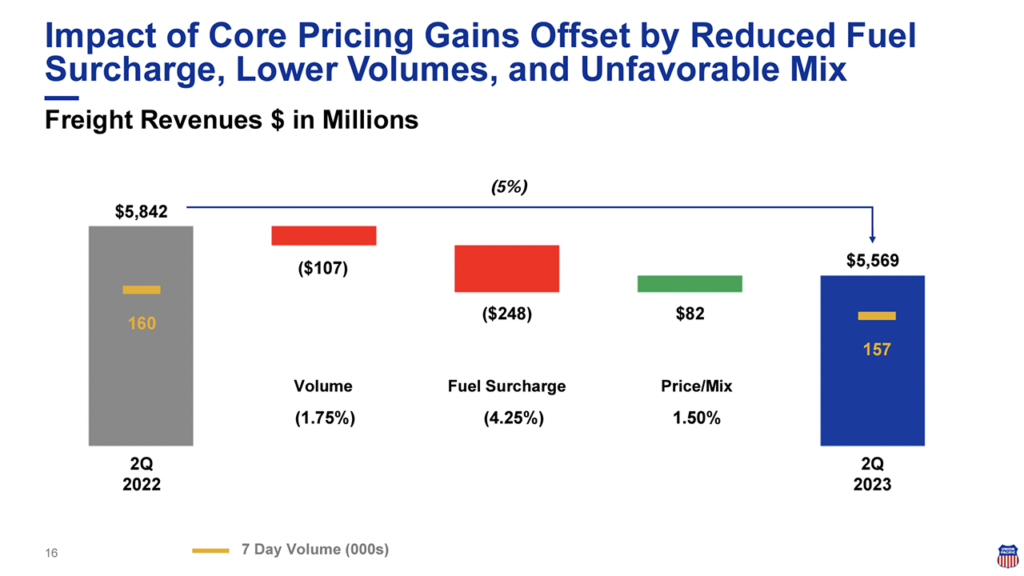 • Operating revenue was $5.96 billion, a 5% decrease from second-quarter 2022’s $6.27 billion, “driven by reduced fuel surcharge revenue, lower volumes, and an unfavorable business mix, partially offset by core pricing gains.”