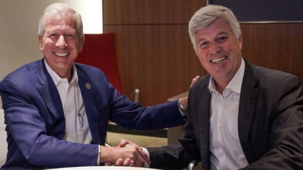 Union Pacific Chairman, President and CEO Lance Fritz (left) with Shell’s Carlos Maurer, Executive Vice President-Sectors and Decarbonization. (Photograph Courtesy of UP)