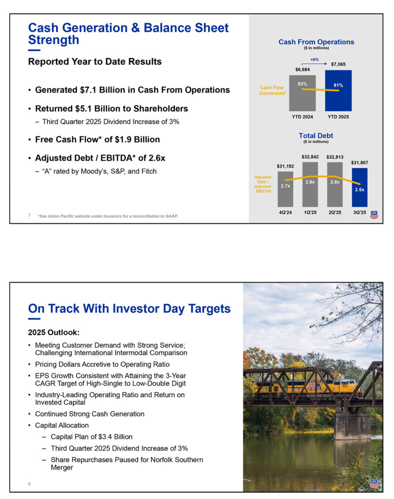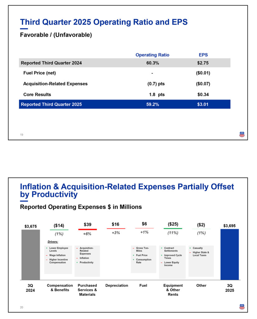 UP reported 3Q25 net income of $1.8 billion, or $3.01 per diluted share. Those results include merger costs of $41 million, or $0.07 per diluted share. Adjusted 3Q25 (non-GAAP) net income of $1.8 billion, or $3.08 per diluted share, compares to 3Q24 net income of $1.7 billion, or $2.75 per diluted share.