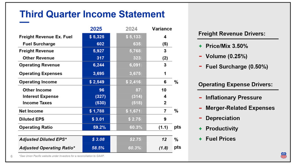 With an STB merger filing for acquiring Norfolk Southern targeted for no later than Dec. 1, Union Pacific posted a solid third-quarter 2025, showing “strong operating income growth driven by increased revenue and operating efficiency” and “a best-ever quarter record for freight revenue, excluding fuel surcharge.”