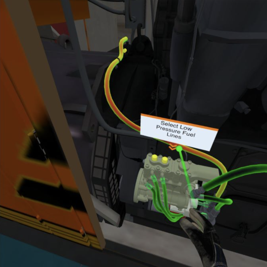 Pictured: A BNSF student using virtual reality to learn how to adjust the gear lash on a high-pressure fuel pump. (Screen Grab from BNSF video)