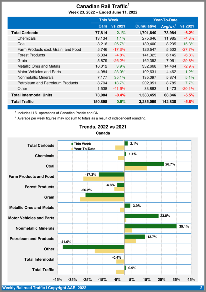 Canadian railroads reported 77,814 carloads for the week, up 2.1%, and 73,084 intermodal units, down 0.4% from the same week in 2021. For the first 23 weeks of 2022, they reported cumulative rail traffic volume of 3,285,099 carloads, containers and trailers, down 5.8%.