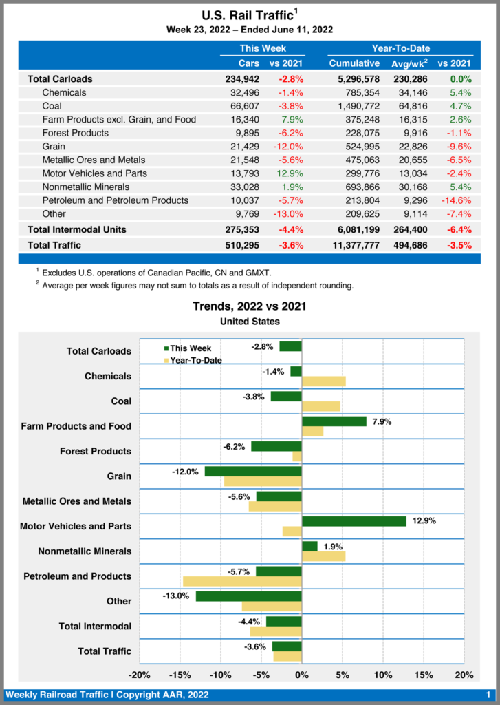 For Week 23, total U.S. weekly rail traffic came in at 510,295 carloads and intermodal units, decreasing 3.6% from the same week in 2021. U.S. Class I railroads moved 234,942 carloads, down 2.8% from last year; and 275,353 containers and trailers, down 4.4%, according to AAR.