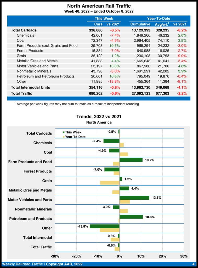 Three of the 10 carload commodity groups posted an increase for the week ending Oct. 8, 2022, compared with the same week in 2021. They were motor vehicles and parts, up 908 carloads, to 13,955; farm products excluding grain, and food, up 817 carloads, to 16,909; and petroleum and petroleum products, up 592 carloads, to 9,993. Commodity groups that posted declines included chemicals, down 2,750 carloads, to 30,187; miscellaneous carloads, down 1,496 carloads, to 9,425; and metallic ores and metals, down 1,395 carloads, to 20,995.