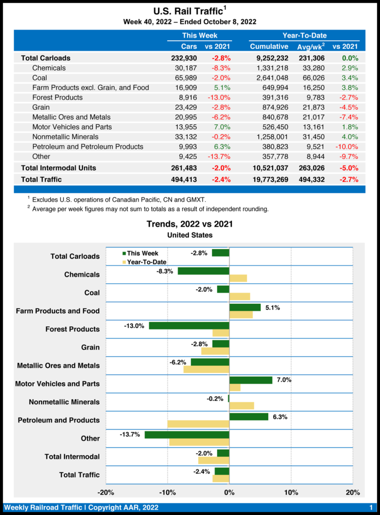 U.S. freight rail traffic dipped yet again in Week 40, compared with the prior-year period, as carloads fell just below 3% and intermodal dropped 2%, the Association of American Railroads (AAR) reported for the week ending Oct. 8, 2022. Mexican and Canadian volumes fared far better.