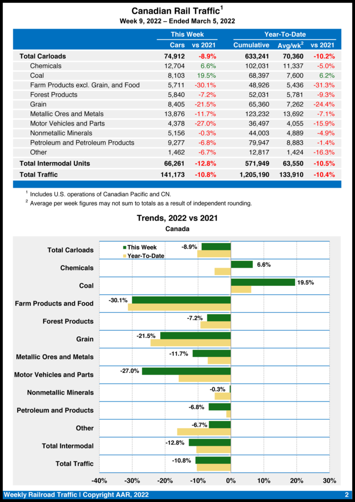Canadian railroads reported 74,912 carloads for the week, an 8.9% drop, and 66,261 intermodal units, a 12.8% fall-off from the same week in 2021. For the first nine weeks of 2022, they reported cumulative rail traffic volume of 1,205,190 carloads, containers and trailers, down 10.4%.