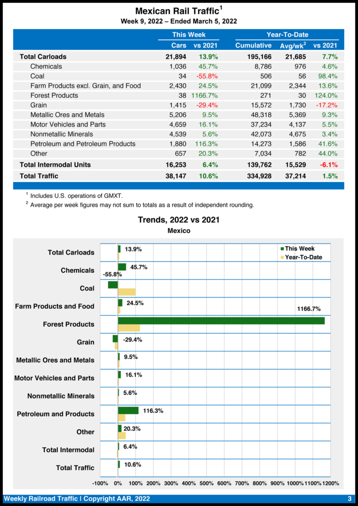Mexican railroads reported 21,894 carloads for the week, rising 13.9% from the same week in 2021, and 16,253 intermodal units, increasing 6.4%. Their cumulative volume for the first nine weeks of 2022 was 334,928 carloads and intermodal containers and trailers, a 1.5% gain over the prior-year period.