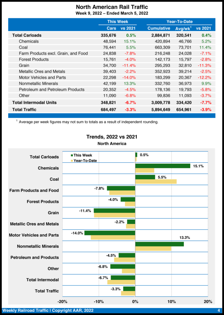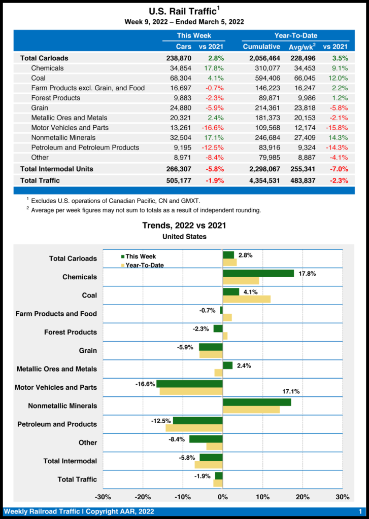 For the week ending March 5, 2022, U.S. rail traffic came in at 505,177 carloads and intermodal units, dipping 1.9% from the same week last year, based on 238,870 carloads—up 2.8% from 2021—and intermodal volume of 266,307 containers and trailers—down 5.8%, the Association of American Railroads (AAR) reported on March 9.