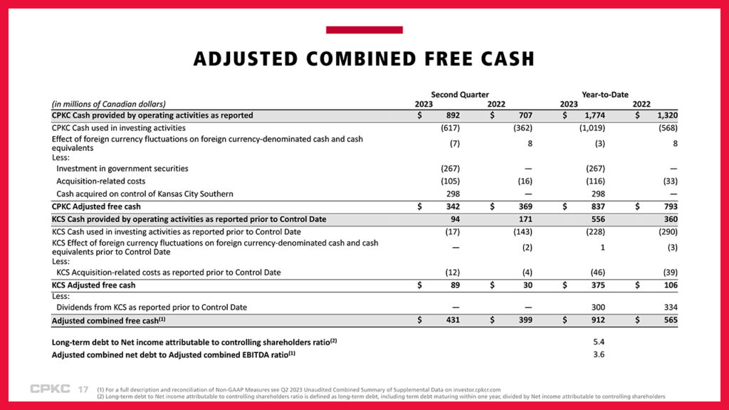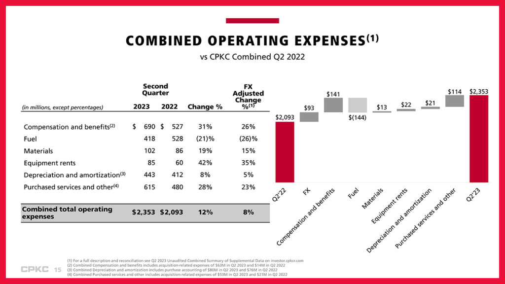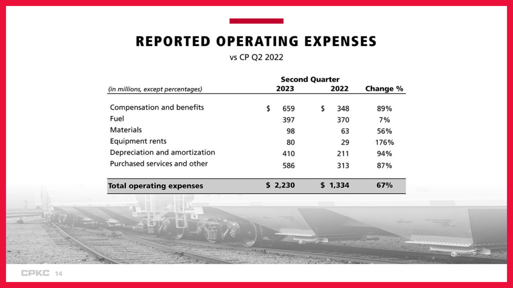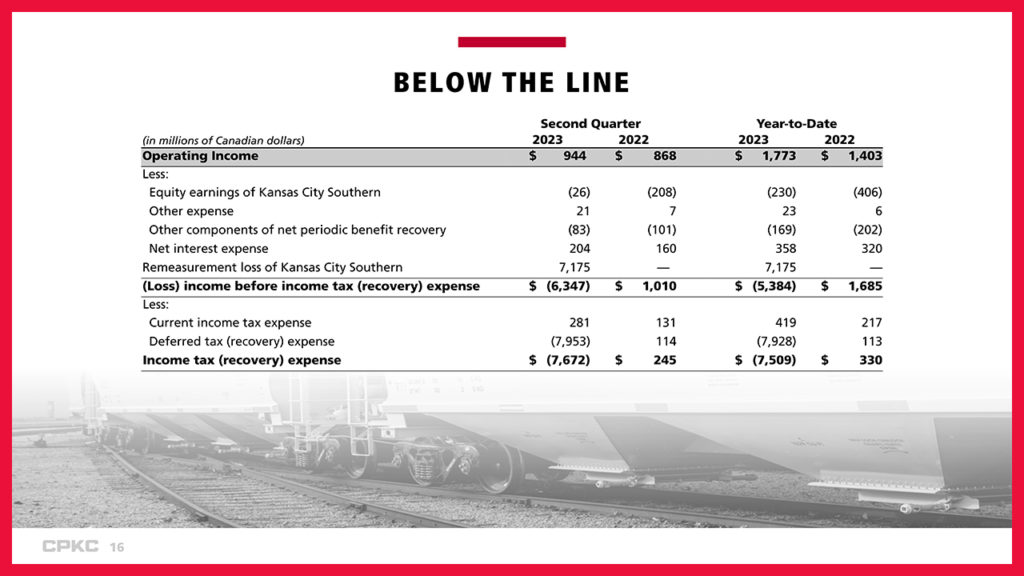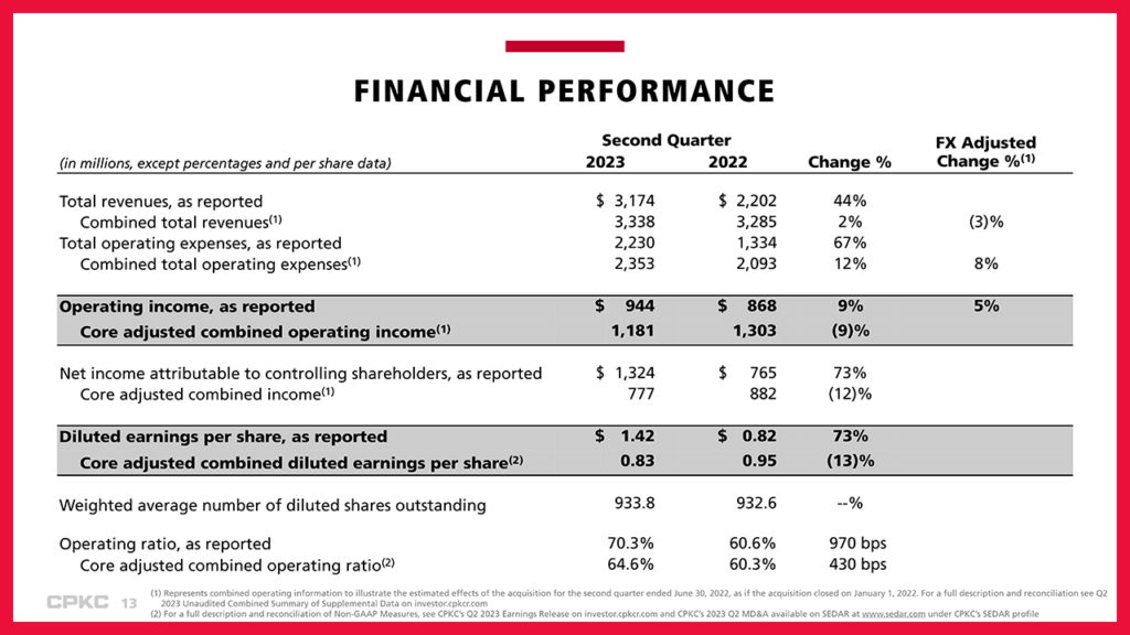 CPKC noted that its 2Q23 results, compared to the prior-year period, reflected the companyrecording its interest in KCS under the equity method of accounting from Dec. 14, 2021 to April 13, 2023: