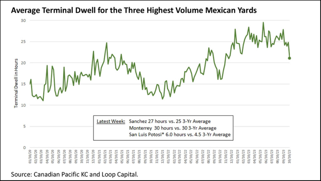 Average terminal dwell for the three high-volume Mexican yards (Sanchez, Monterrey, San Luis Potosi) dropped from 24.8 to 21.3 hours in the week ending Oct. 13, which is a low we haven’t seen since last November, and remained relatively unchanged the week ending Oct. 20 at 21.7. Sequentially, from the week ending Oct. 6, dwell at Sanchez dropped from 32.1 to 23.5 hours, and Monterrey fell from 35.2 to 32.9 hours.