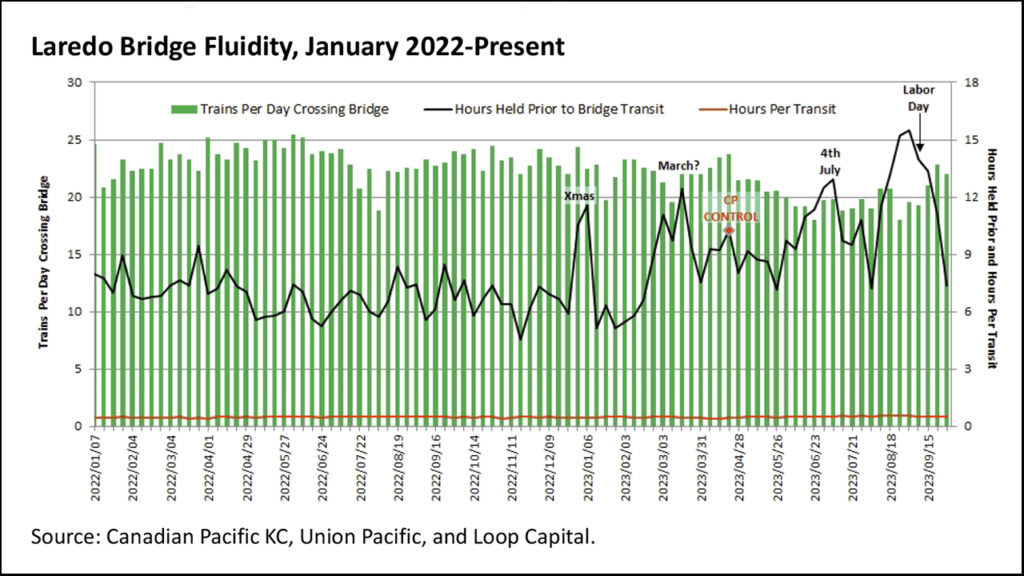 Starting on Oct. 15, CPKC began filing data to the STB related to oversight of its KCS integration. The main operational file is a spreadsheet that goes back five years, by week, and totals 45,000 rows. While this feels like overkill, one thing that caught our eye was historical data related to the Laredo rail bridge. Laredo is highly significant in two ways. First, it’s by far the most important freight (both rail and truck) gateway between the U.S. and Mexico; hence efficiency and fluidity here matters. Laredo’s importance will also grow if this whole near-shoring thing starts to gain momentum.