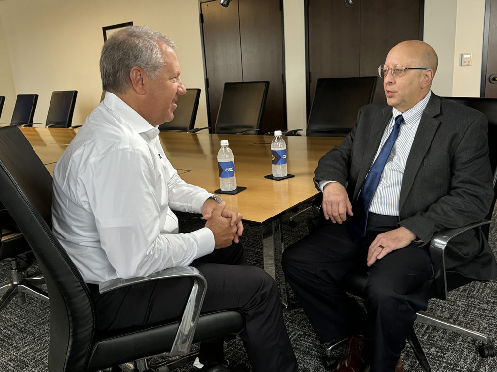 Joe Hinrichs and William C. Vantuono at CSX’s Jacksonville, Fla. headquarters, Nov. 6, 2024. Photo by Bryan Tucker, CSX.