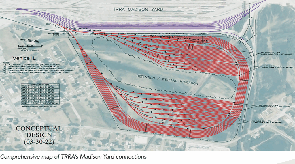 - St. Louis Multimodal Freight Yard Expansion at Madison Yard and Rail Improvements in St. Clair County, Ill. (partially funded for construction): This project is focused on expanding railcar capacity at Terminal Railroad Association of St. Louis’ (TRRA) Madison Yard in Venice, Ill., which is near St. Louis, Mo. TRRA—Railway Age’s 2020 Short Line of the Year—owns a 100-acre site adjacent to the classification yard that can be used for expansion. The project would increase the current capacity of 2,500 railcars by 1,500 to hold a total of 4,000 cars. “This project benefits not only TTRA, but also the entire national freight network, as it adds capacity at a strategic freight node with connectivity to all Class I national rail carriers, inland ports of St. Louis, and truck terminals,” the Freightway reported. “It will also positively affect travel times for Amtrak by reducing delays from blocked main lines due to yarding today’s larger freight trains. Specifically, the project will allow increased efficiencies for the Mississippi River freight network for river-to-rail connections by being able to stage trains off the main lines; allow for more Storage-in-Transit opportunities; and alleviate freight rail congestion in St. Louis and other midwestern markets. Investment in the project will contribute to the growing regional multimodal logistics sector and support the critical redundancy TRRA’s Madison Yard provides in the regional and national rail network. Such investment in the national freight infrastructure is critical for future economic growth and will help to ensure the regional rail network can accommodate growing demand. The project is consistent with the strategic goals and objectives of USDOT’s National Freight Strategic plan.” The project cost is estimated at $69.3 million. TRRA has applied to the Federal-State Partnership for Intercity Passenger Rail Grant Program (FSP) for a grant to cover 80% of the project cost and the remaining 20% will be covered by TRRA, according to the Freightway. The Illinois Transfer 3rd Main Railroad Track project between the TRRA Madison Yard and Willows Interlocking in East St. Louis “will address freight bottlenecks downstream to the new double track Merchants Bridge by addressing yard congestion due to today’s longer trains,” the Freightway reported. This project, it noted, “will deliver fewer blocked grade crossings for shorter periods of time, less wasted locomotive emissions due to idle trains in an Environmental Protection Agency non-attainment area, higher utilization of the region’s Mississippi River intermodal ports, and will create more jobs due to the ability to more efficiently process freight in the St . Louis region.” At-grade rail crossings benefiting from this project will include St. Clair Ave., IL Rte. 15 (Missouri Ave.), Martin Luther King Dr., and IL Rte. 3. The estimated project cost is $28.7 million, and the Freightway said $15.3 million is funded through the Illinois Department of Transportation’s Competitive Freight Program.