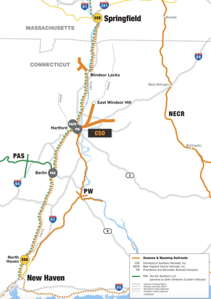 CSO interchanges with CSX at Springfield, Mass., and New Haven, Conn.; Central New England Railroad at Hartford, Conn.; G&W’s Providence and Worcester Railroad at Hartford, Conn.; and Pan Am Southern Railroad operated by G&W’s Berkshire & Eastern Railroad at Berlin, Conn.