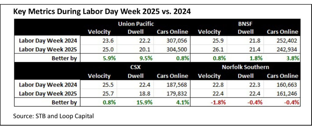 With that as a backdrop, last week’s operating data, through Sept. 5, includes Labor Day on Sept. 1; the third of the four big public holidays during the year that impact rail operations. With lower customer activity suppressing volumes by 8% compared to the week prior, the railroads did what they always do: accelerate.