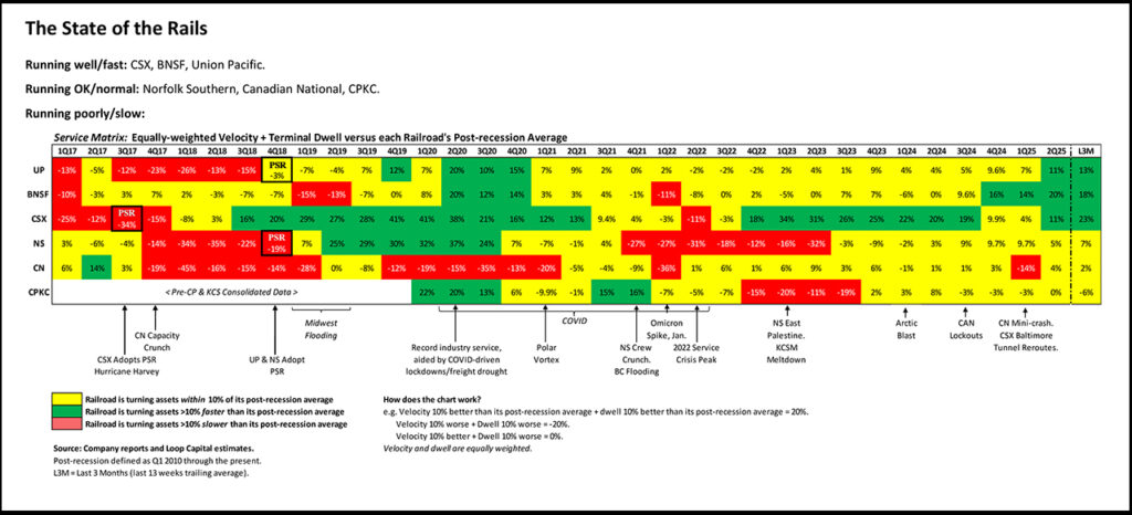 Transposing that to the rails, and we have the Meltdown Period from 2014-2022, Recovery Period from 2023-Spring 2025, and in recent months the railroads are flirting with their BAOE Period: Beautiful Absence Of Emergencies. Even hurricane season has been canceled. It’s like watching disaster movies non-stop for 11 years and then all of a sudden there’s nothing on TV apart from nature shows with blue skies and cheeky monkeys. This routine normalcy is going to take some getting used to.