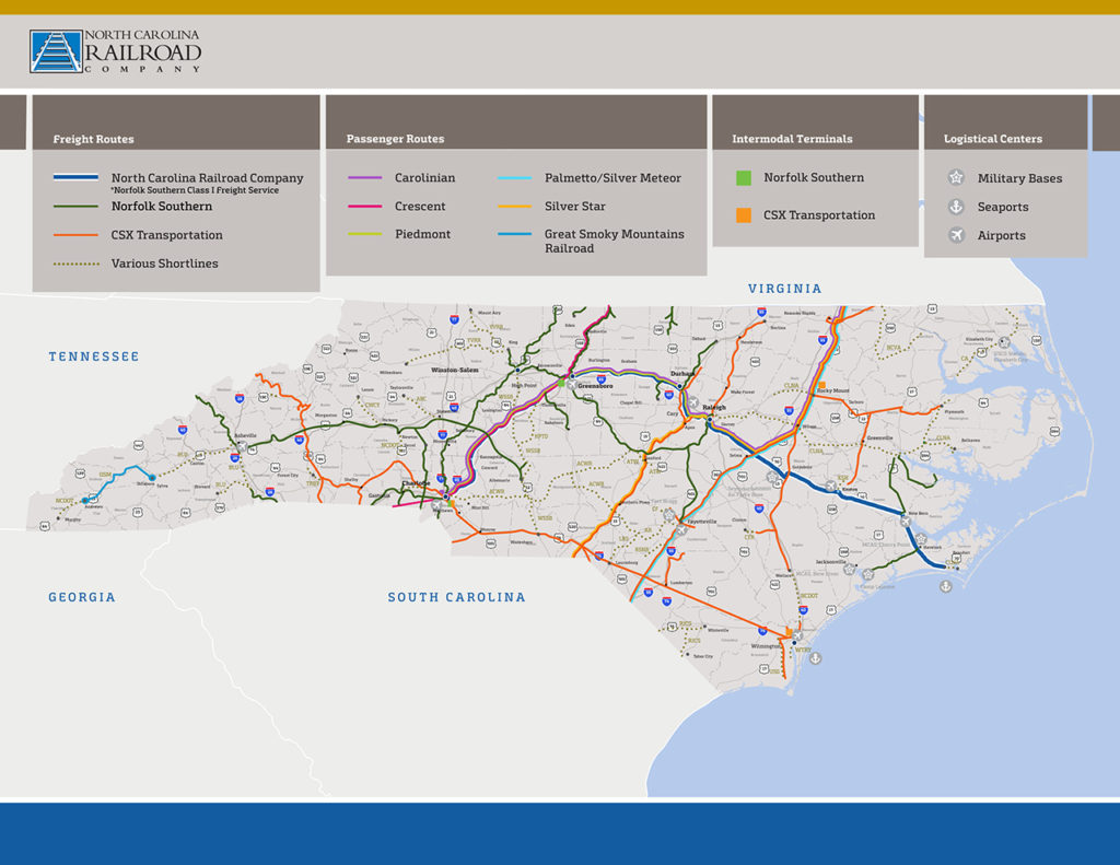 NCRR noted that CSX and Norfolk Southern offer direct access to North America’s massive intercity rail network and together, operate three-fourths of North Carolina’s track. Both offer direct service to the major ports located along the eastern seaboard as well as intermodal container service for North Carolina companies through their respective hubs in Charlotte (NS, CSX) and Greensboro (NS). North Carolina is also home to 19 Class II and III railroads, which “can provide essential service advantages for the first and last mile where it may sometimes be operationally challenging for a Class I provider.” Six of these railroads offer direct connections to both CSX and NS.