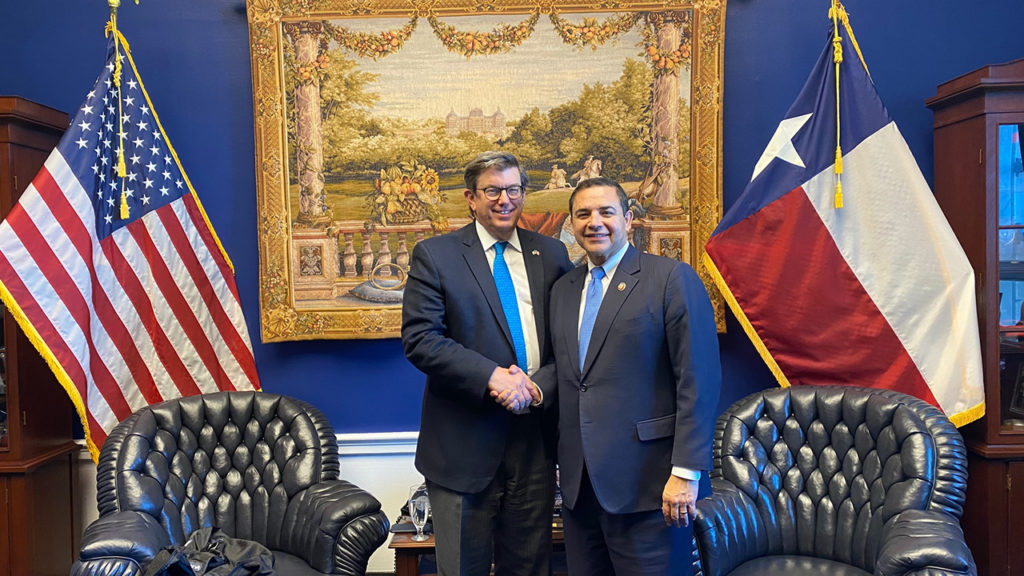 Pat Ottensmeyer with Congressman Henry Cuellar (D-Tex.) in his Capitol Hill office just before the USMCA vote. CPKC photo.