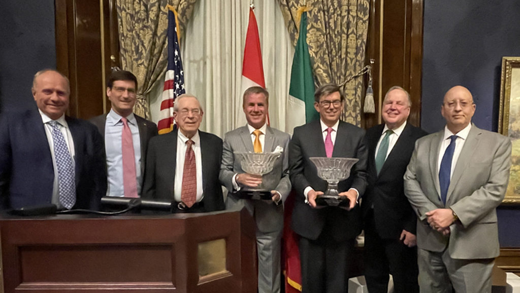 Left to right at the 2022 Railroader of the Year dinner: Railway Age Publisher Jon Chalon; 2018 Railroader of the Year Jack Hellman; 1999 Railroader of the Year Ed Burkhardt; 2022 Railroaders of the Year Keith Creel and Pat Ottensmeyer; 2001 Railroader of the Year Mike Haverty, and Railway Age Editor-in-Chief William C. Vantuono.