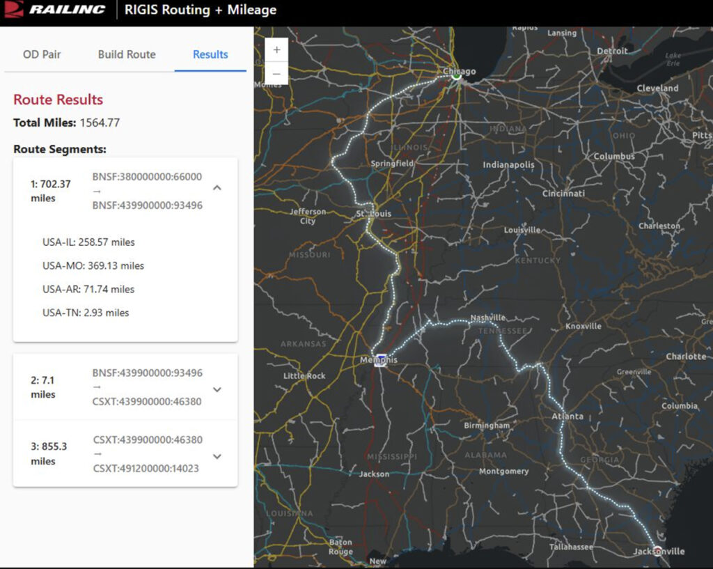 RIGIS is described as “the central repository for North American railroad spatial locations and accurate mileage data on the railroad network.” It provides regulatory, financial settlement, and safety benefits for stakeholders including shippers, car owners, railroads, and local first responders. With its “unique routing and mileage tool, RIGIS allows users to visualize and analyze routes with a high degree of accuracy,” according to Railinc. “When an origin and destination are entered, the application displays the carriers involved and breaks down the mileage by state. Users can refine results by selecting preferred carriers or build their own routes with multiple network locations, including the ability to require junctions at specific interchange locations. The underlying API is highly scalable and highly available, ensuring reliable performance under heavy loads.”