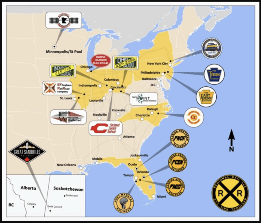 Since partnering in July 2019, 3i and Regional Rail have grown from three railroads in the Northeast to 17 across North America (see map below). In addition to MNNR, their other railroads are Burns Harbor Railroad; Carolina Coastal; Cincinnati Eastern Railroad; East Penn; Effingham Railroad Company; Florida Central; Florida Northern; Florida Midland; Great Sandhills Railway, a Railway Age 2025 Short Line of the Year Honorable Mention; Illinois Western; Indiana Eastern Railroad; Middletown & New Jersey; Port Manatee Railroad; Ohio South Central Railroad; South Point & Ohio Rail; and Tyburn.