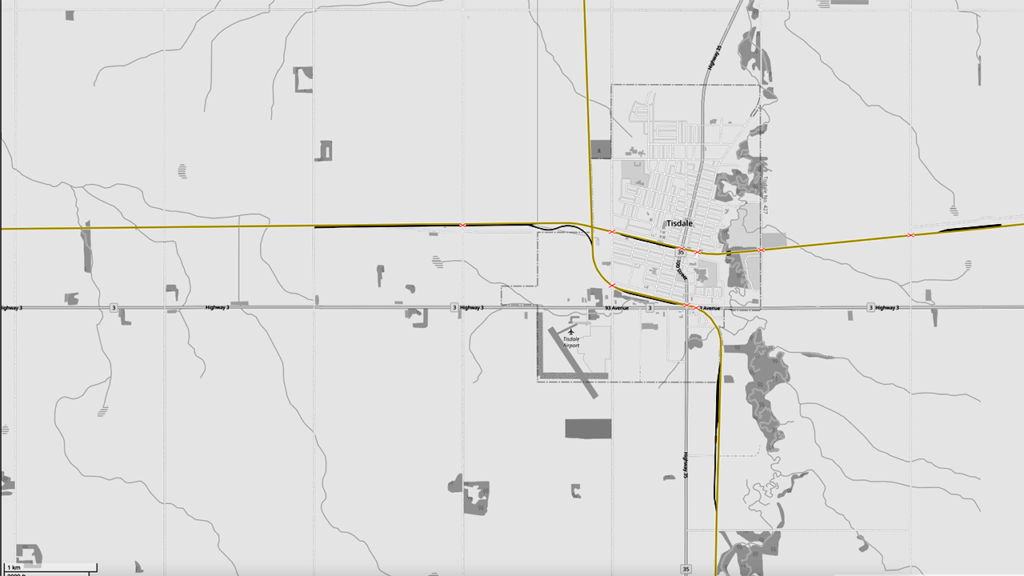 Tisdale is indicated in red. Google Maps