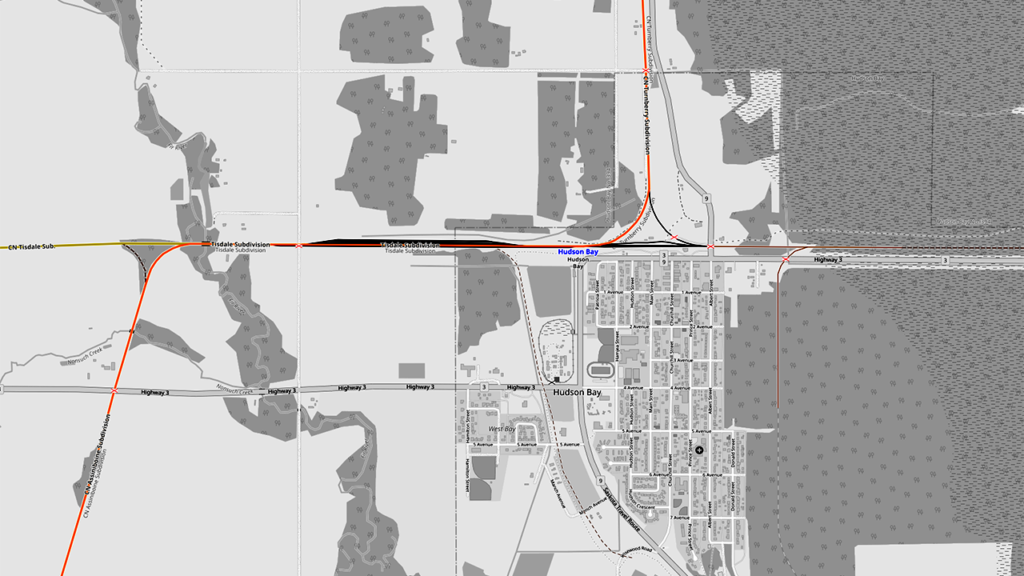 Hudson Bay Railway consists of 627 miles of former CN trackage. It connects with CN’s Turnberry Subdivision at The Pas. AGG map.