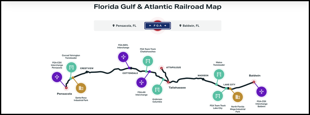 FGA operates on 430 route miles of track running east-west along the Interstate 10 corridor between Baldwin and Pensacola, Fla., with a branch line that extends from Tallahassee, Fla., to Attapulgus, Ga.