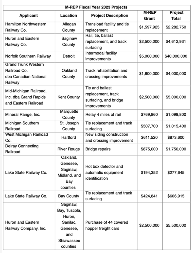 “With approximately 3,600 miles of rail corridors in Michigan operated by 29 freight railroads, freight rail keeps our diverse economy rolling,” said Governor Gretchen Whitmer. “From farmers depending on rail to haul their crops to market to auto manufacturers shipping finished products across North America, rail creates jobs and serves communities across our state. The 2023 Michigan Rail Enhancement Grant will invest $19 million across Michigan, ensure our rail system is safe, efficient, and meets Michigan’s economic and transportation needs. Let’s continue working together to keep Michigan’s rail economy on track.”