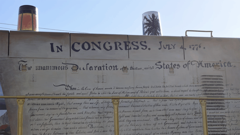 - The back of the cab displays “red, white, and blue fireworks (fireworks being a tradition set by John Adams from America’s inception).”