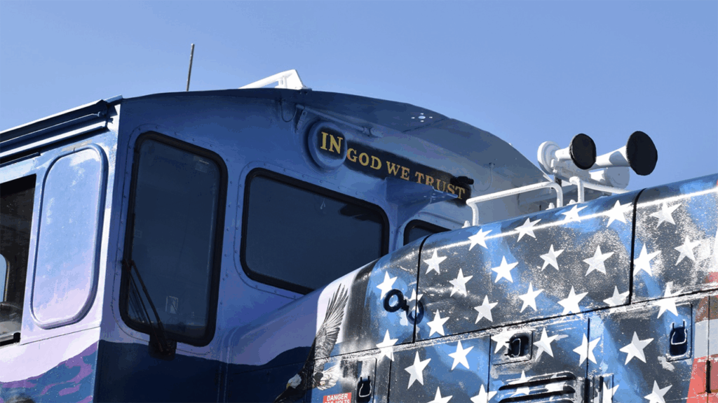 - On the cab, below the hood, is the phrase “IN GOD WE TRUST,” and on top of the cab roof is “the full inscription found on the Liberty Bell (derived from Leviticus 25:10), ‘Proclaim liberty throughout all the land unto all inhabitants thereof.’”