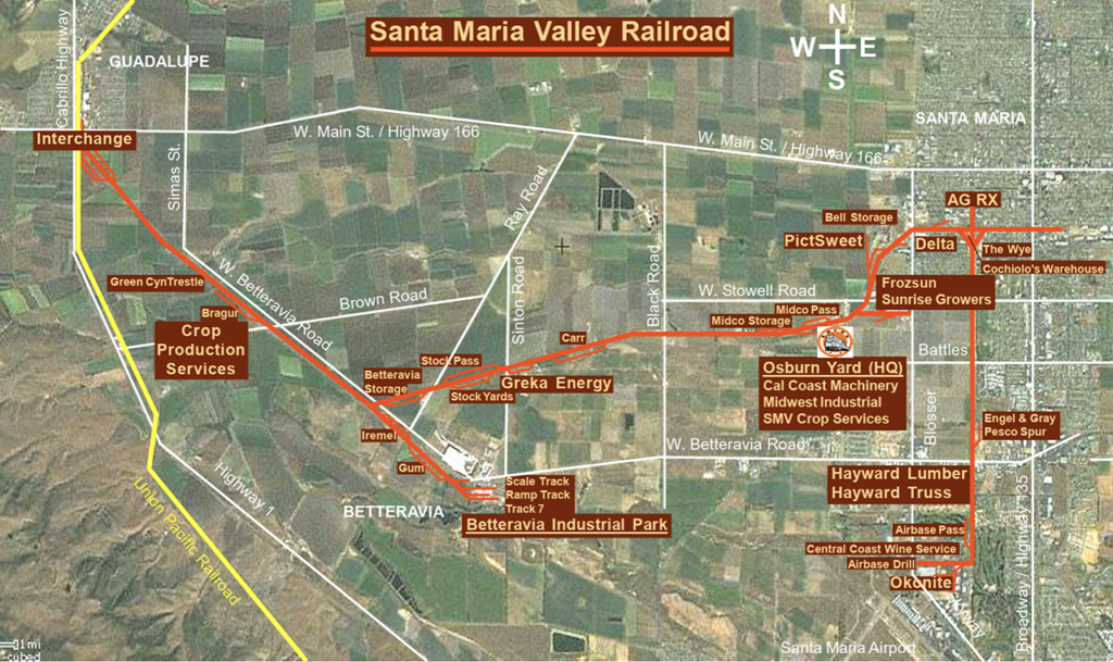 Denver, Colo.-based OmniTrax on March 12 reported entering the partnership with Coast Belle Rail Corporation, which has run the 14.7-mile SMVRR since 2006. The short line serves Central Coast Valley commercial and agricultural customers and interchanges with Union Pacific at Guadalupe (see map below). It offers numerous sidings and spurs that “support future growth capacity,” OmniTrax noted, as well as transload facilities at the Osburn Rail Yard in Santa Maria. Official operations kicked off June 11 with a ribbon-cutting ceremony.