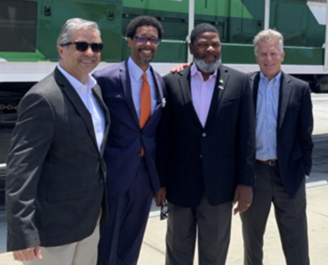 Standing in front of the PHL EMD® SD40JR Joule are (left to right): Salvatore G. Di Costanzo, Port Liaison Labor Relations Representative, International Longshore and Warehouse Union, Local 13; Robert E. Primus, Chairman, STB; Otis L. Cliatt II, President, PHL; and Peter Gilbertson, President and CEO, Anacostia Rail Holdings. (PHL Photograph)